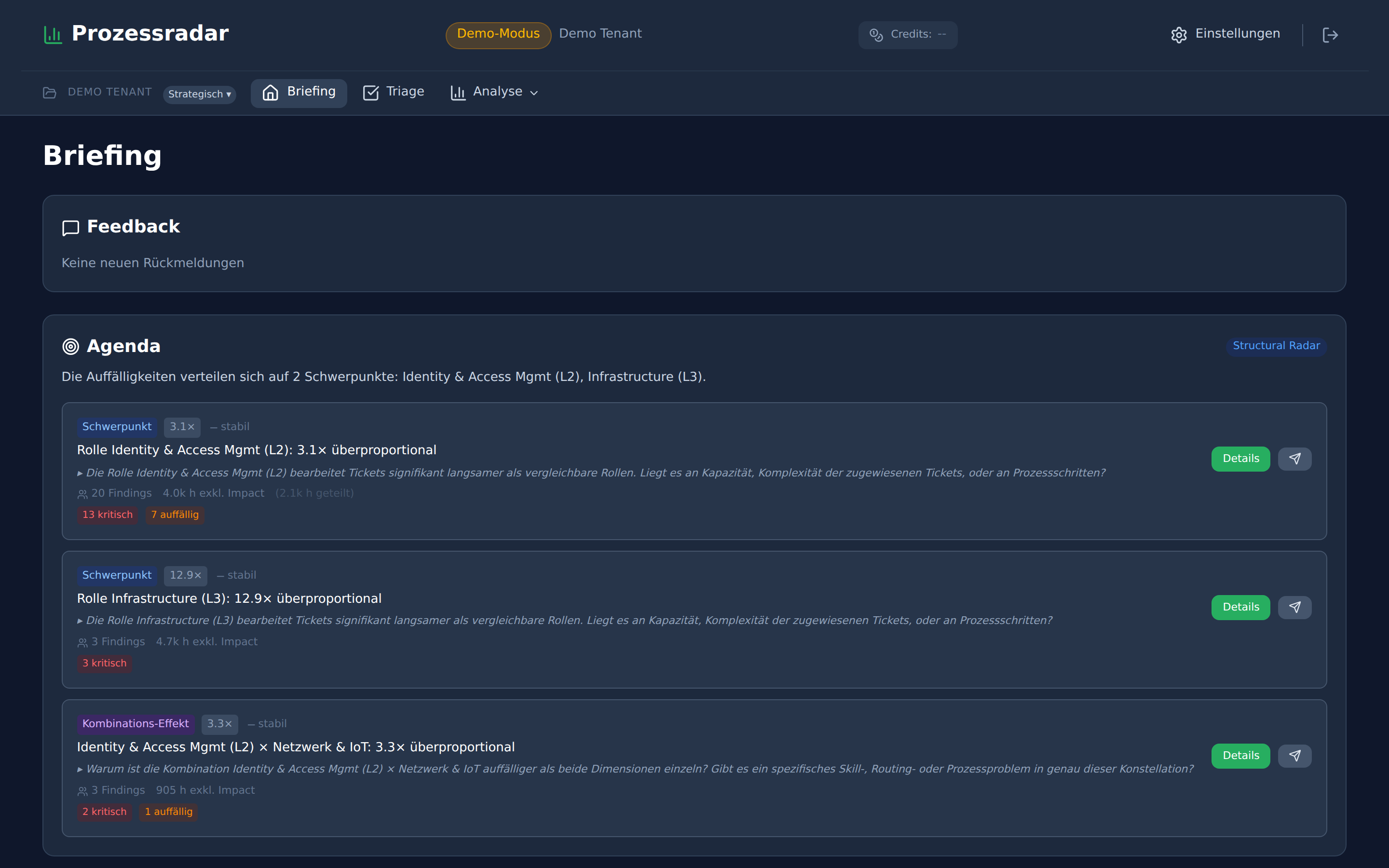 Und wenn du sehen willst, wie so ein Briefing für deine Organisation aussieht: Process Radar generiert es automatisch aus deinen Ticket-Daten. Konnektor einrichten oder CSV hochladen, Agenda sehen, delegieren.